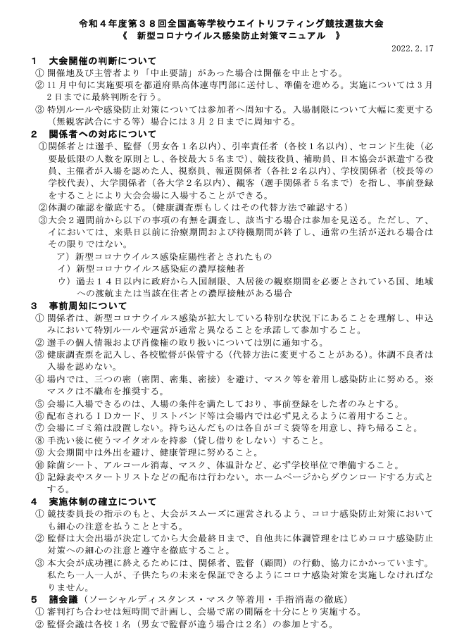 第38回全国選抜大会における新型コロナウイルス感染症に対する感染防止対策マニュアルを掲載いたしました。